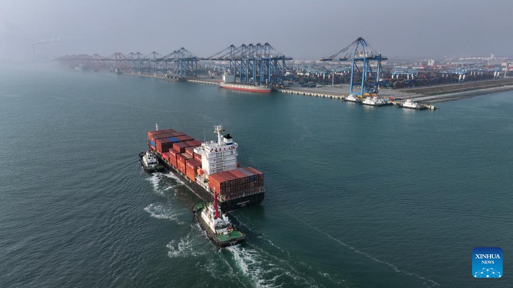 Ein Schiff beim Anlegen und Entladen von Containern im Hafen von Qinzhou. (4. März 2025, Xinhua)