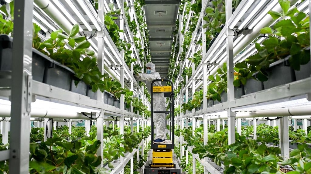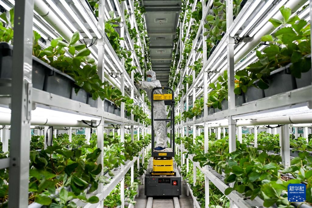 In der Pflanzenfabrik eines Agrarindustrieparks kümmert sich ein Mitarbeiter um Erdbeerpflanzen. (28. Februar 2025, Xinhua)