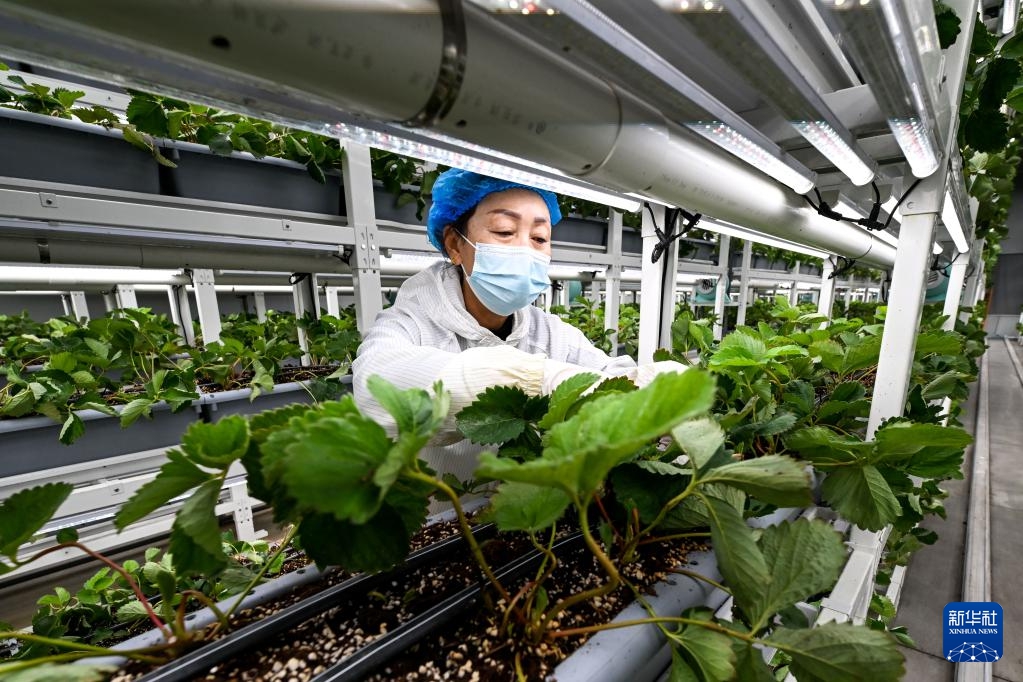 In der Pflanzenfabrik eines Agrarindustrieparks in Hohhot kümmert sich ein Mitarbeiter um Erdbeerpflanzen. (28. Februar 2025, Xinhua)