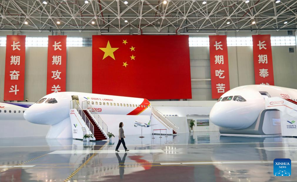 Zhao Chunling geht in einem Forschungsinstitut derCOMAC in Shanghai an einem Modell der Flugzeuge C919 und C929 vorbei. (Foto vom 5. März 2025, Xinhua/Liu Ying)