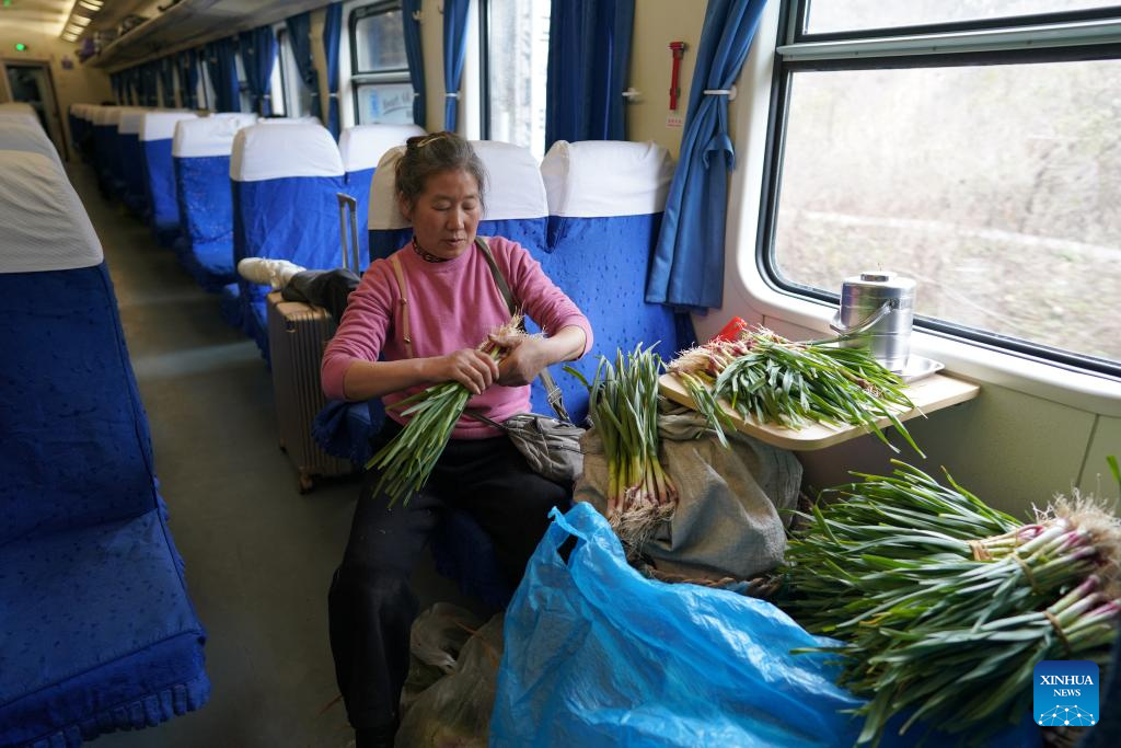 Eine Frau sortiert Gemüse im Zug Nr. 6064, der von Guangyuan in der südwestchinesischen Provinz Sichuan nach Baoji in der nordwestchinesischen Provinz Shaanxi fährt. (Foto vom 17. Februar 2025, Xinhua/Shao Rui)
