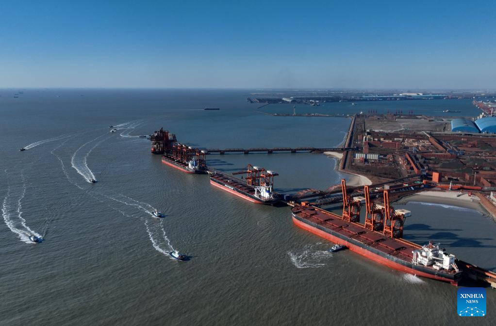 Die Drohnenaufnahme zeigt Schiffe, die im Erzdock des Hafengebiets Caofeidian des Tangshan-Hafens in der nordchinesischen Provinz Hebei Fracht entladen. (Foto vom 9. Januar 2025, Xinhua/Yang Shiyao)