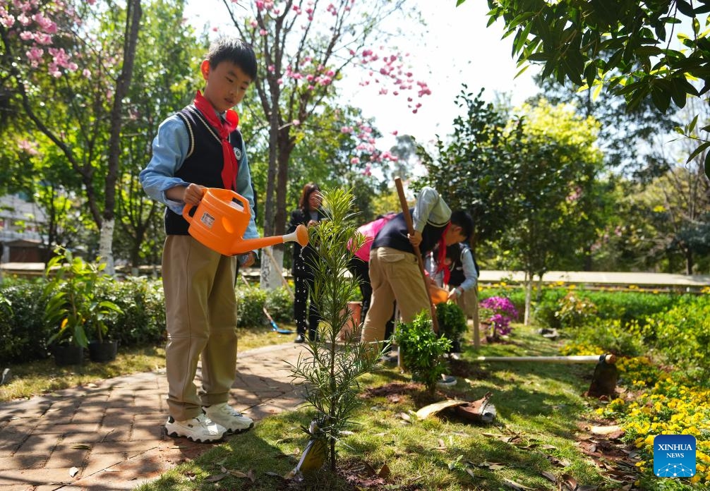 Ein Junge gießt Setzlinge in Kunming. (11. März 2025, Xinhua)