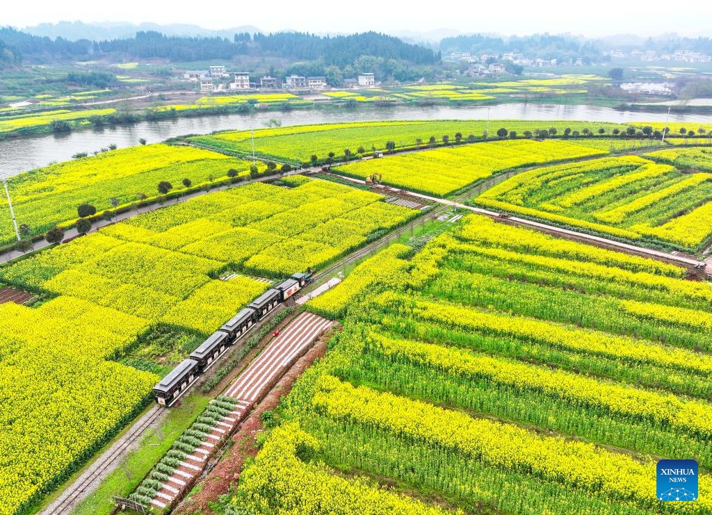 Ein Zug fährt auf einer Strecke über das Rapsblütenfeld in Chongqing. (12. März 2025, Xinhua)