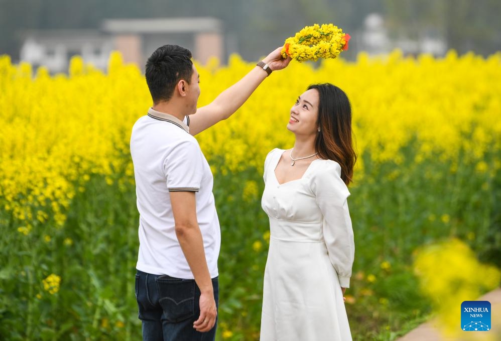 Touristen posieren für Fotos zwischen den Rapsblüten. (12. März 2025, Xinhua)