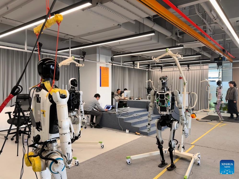 Humanoide Roboter werden im Zhejiang Humanoid Robot Innovation Center in Ningbo darauf trainiert, ihre Arme zu schwingen. (19. Februar 2025, Xinhua)