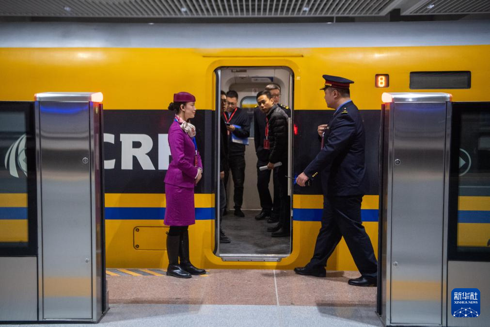 Mitarbeiter besteigenden Hochgeschwindigkeits-Testzug am Bahnhof Chongqing Ost. (Foto vom 13. März 2025, Xinhua/Tang Yi)