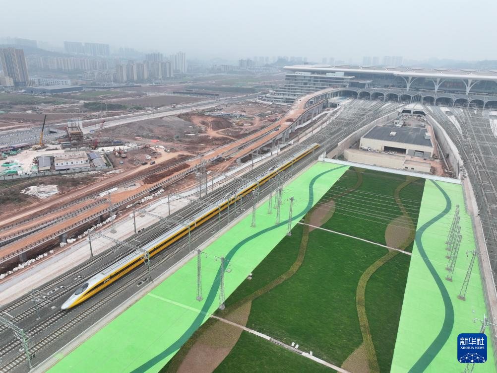 Der Hochgeschwindigkeits-Testzug fährt auf dem Chongqing-Abschnitt der Hochgeschwindigkeitsstrecke Chongqing-Xiamen. (Foto vom 13. März 2025, Xinhua/Tang Yi)
