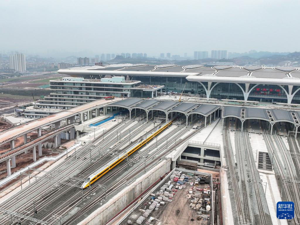 Der Hochgeschwindigkeits-Testzug erreicht den Bahnhof Chongqing Ost. (Foto vom 13. März 2025, Xinhua/Tang Yi)