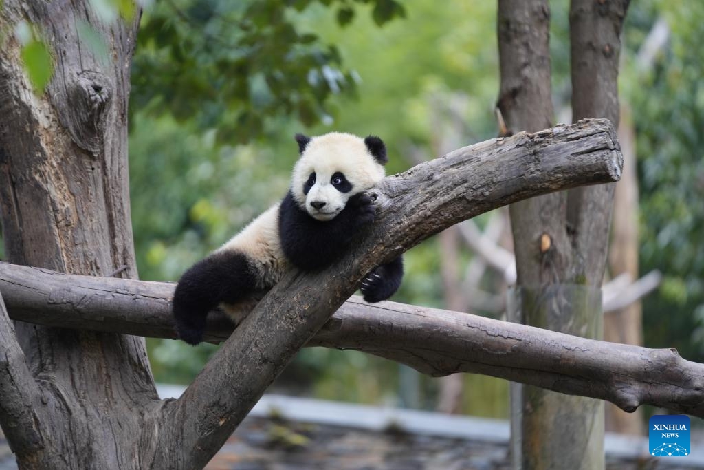 Ein Großer Panda ruht sich auf einem Baum in der Panda-Basis Shenshuping aus. (28. März 2025, Xinhua)