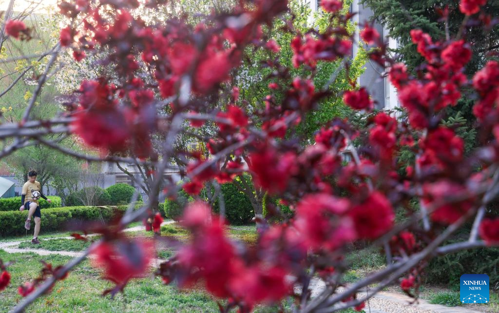 Ein Bürger spielt Fußball in einem Garten in Beijing. (Foto vom 6. April 2025, Xinhua/Yin Gang)