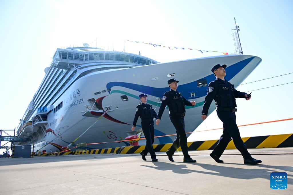 Beamte der Einwanderungsbehörde gehen am International Cruise Terminal in Qingdao an der Adora Magic City vorbei. (Foto vom 6. April 2025, Xinhua/Li Ziheng)