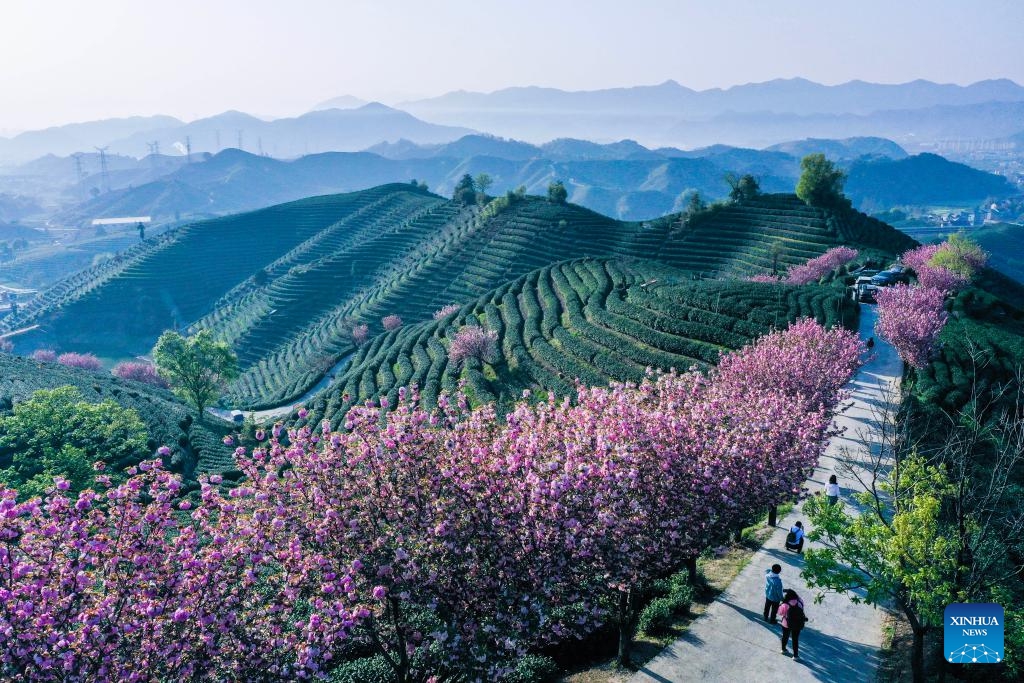 Kirschblüten blühen in einem Teegarten in Hangzhou. (6. April 2025, Xinhua)