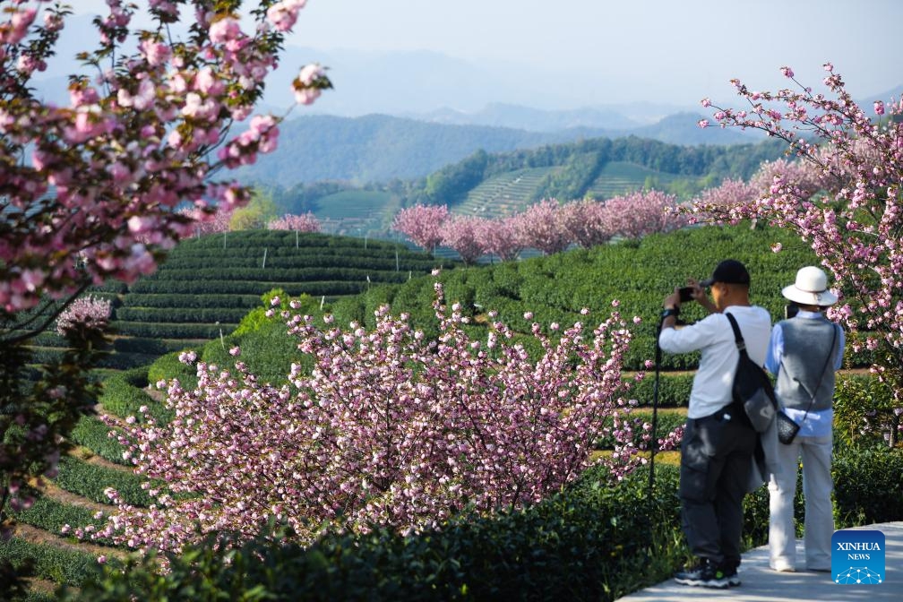 Touristen betrachten Kirschblüten in einem Teegarten in Hangzhou. (6. April 2025, Xinhua)