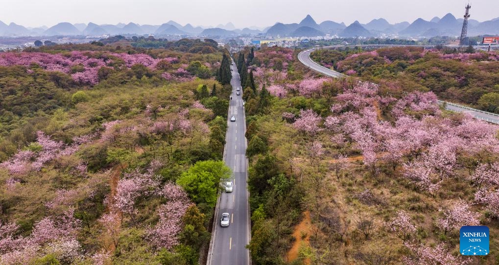 Das Luftbild zeigt Blüten entlang einer Straße in der Stadt Qingzhen. (5. April 2025, Xinhua)