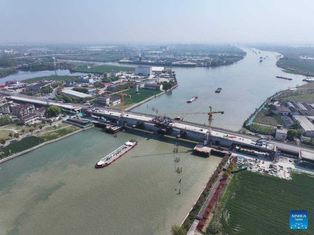 Die Luftaufnahme zeigt Schiffe, die unter der Brückenkonstruktion hindurchfahren. (Foto vom 8. April 2025, Xinhua/Ji Chunpeng)