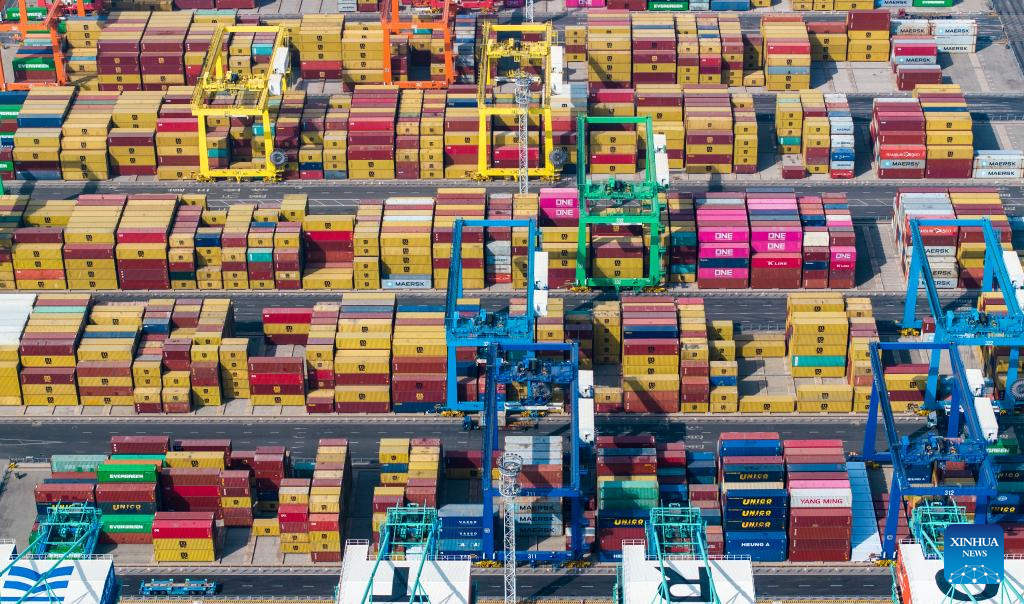 Die Drohnenaufnahme zeigt gelagerte Container auf dem Terminalgelände im Hafen von Tianjin. (Foto vom 8. April 2025, Xinhua/Zhao Zishuo)