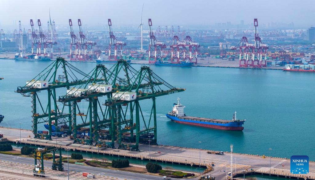 Das Drohnenfoto zeigt ein Frachtschiff, das an einem Containerterminal des Hafens von Tianjin andockt. (Foto vom 8. April 2025, Xinhua/Zhao Zishuo)