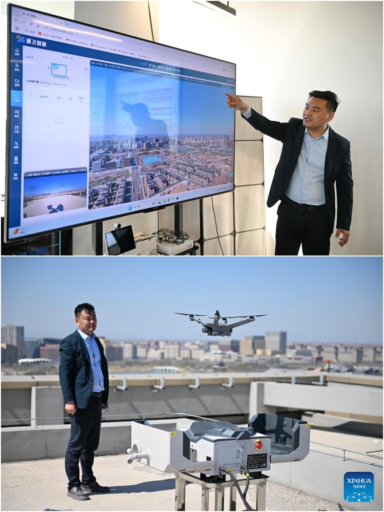 Das Kombinationsfoto zeigt, wie ein Mitarbeiter ein Drohnensystem vorstellt. (19. März 2025, Xinhua)