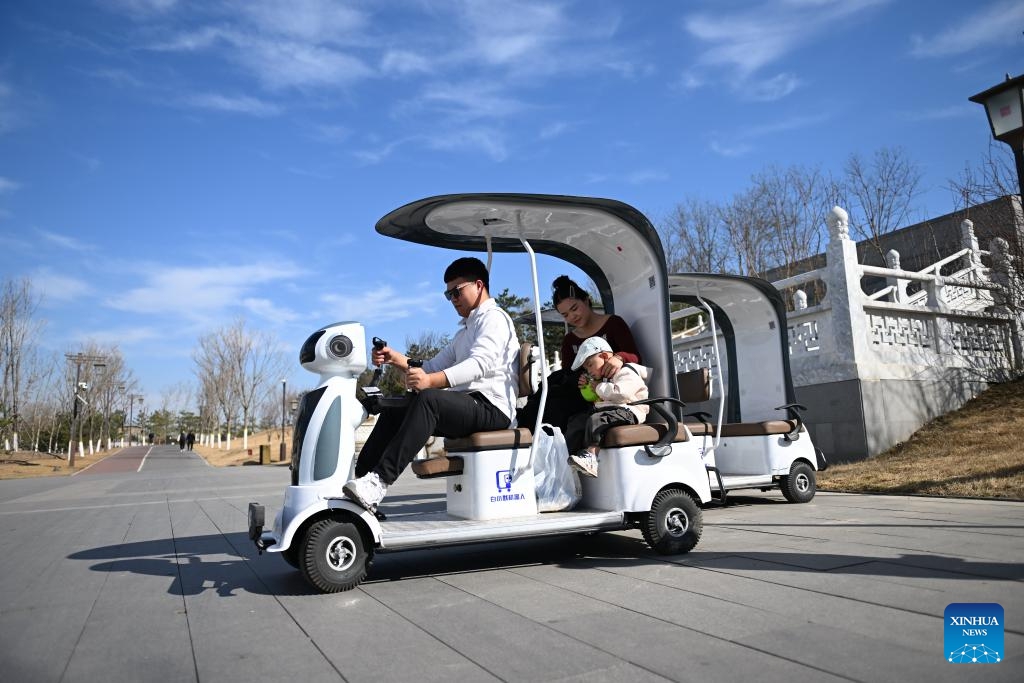 Besucher informieren sich in einem Park in Xiong'an über einen Roboter. (19. März 2025, Xinhua)