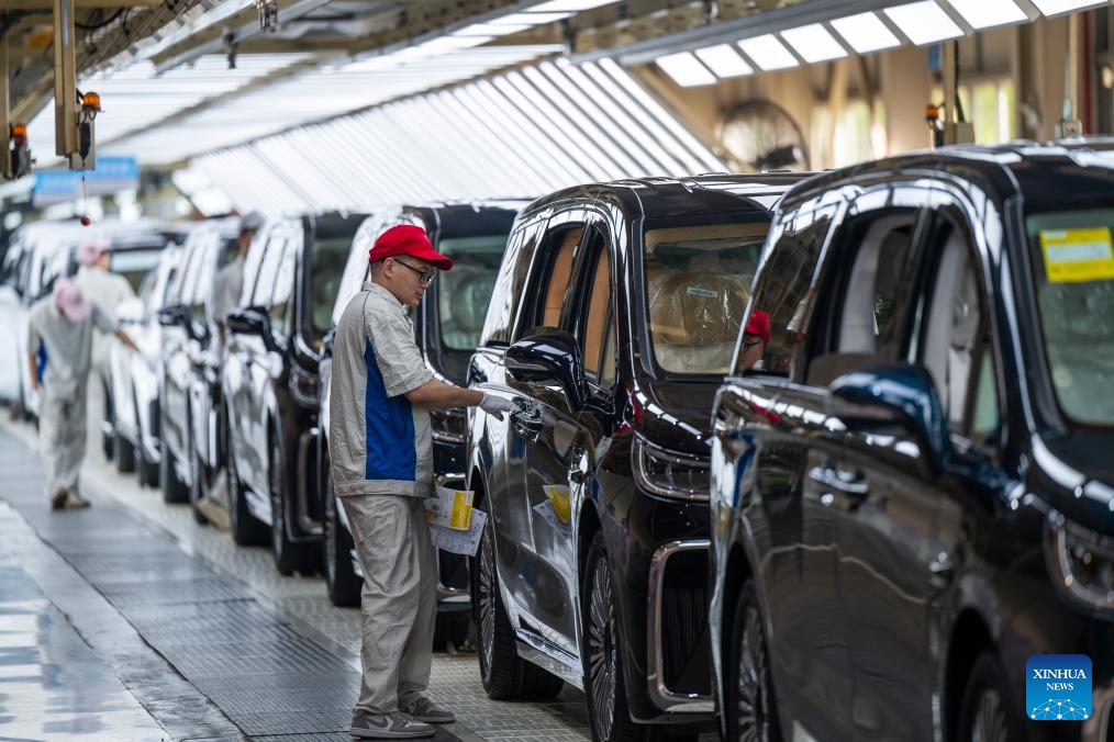 Ein Arbeiter an einem Fließband von Voyah. (9. April 2025, Xinhua)