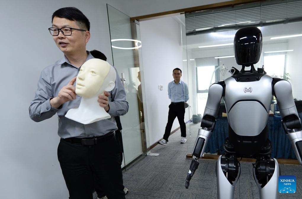 Ein Mitarbeiter der Firma DIGIT stellt die Gesichtshaut eines humanoiden Roboters vor. (27. März 2025, Xinhua)