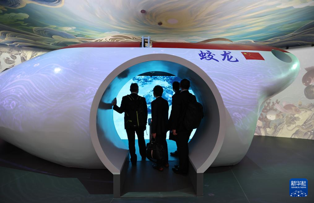 Besucher und Besucherinnen erkunden im chinesischen Pavillon die Tauchkapsel „Jiaolong“ – ein Erlebnisraum zur Simulation von Tiefseetauchgängen. (Foto vom 13. April 2025, Jia Haocheng/Xinhua)