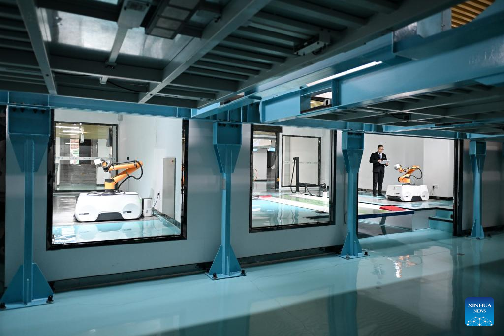 Ein Mitarbeiter testet einen autonomen EV-Laderoboter an einer intelligenten Ladestation in der Xiong‘an New Area in der nordchinesischen Provinz Hebei. (Foto vom 15. April 2025, Xinhua/Mu Yu)