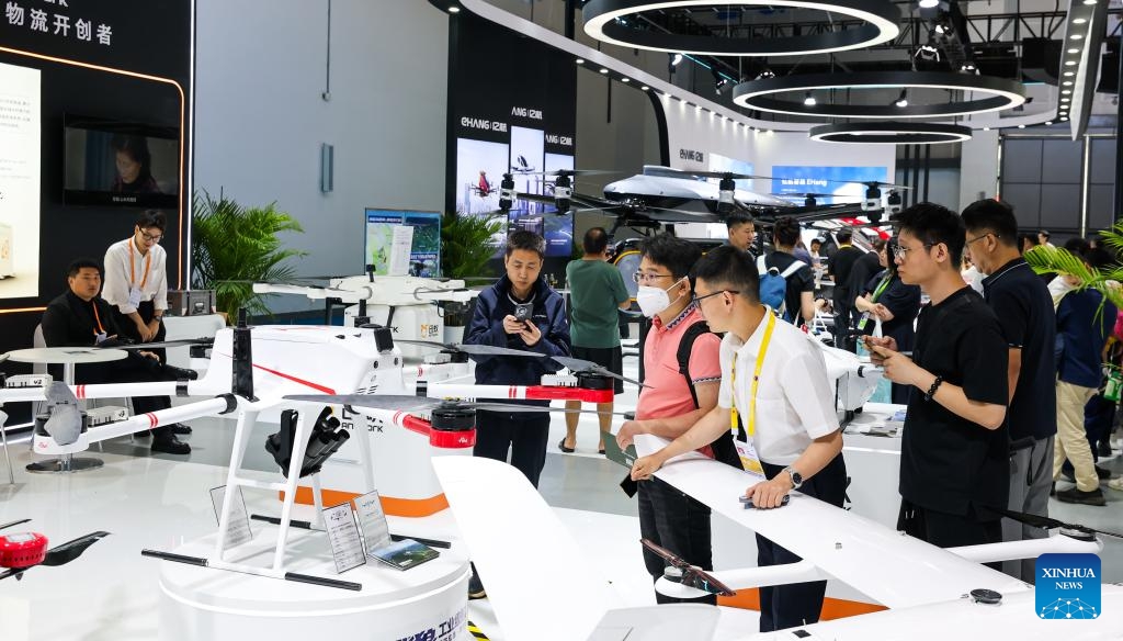 Besucher besichtigen den Ausstellungsbereich für Wirtschaft in geringer Flughöhe auf der 5. CICPE. (15. April 2025, Xinhua)