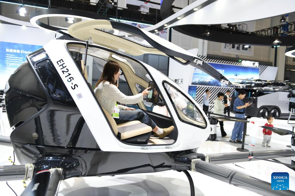 Ein Besucher probiert ein eVTOL EH216-S aus. (15. April 2025, Xinhua)