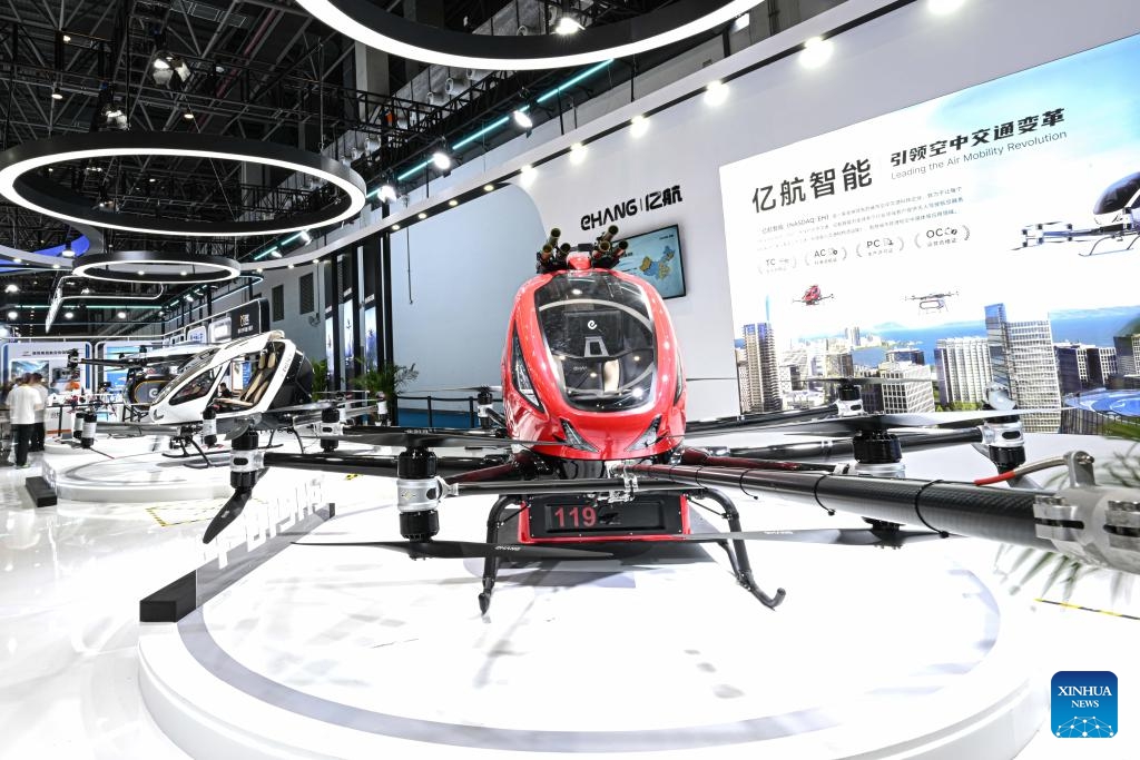 Ein unbemanntes Flugzeug zur Brandbekämpfung in hohen Gebäuden wird ausgestellt. (15. April 2025, Xinhua)