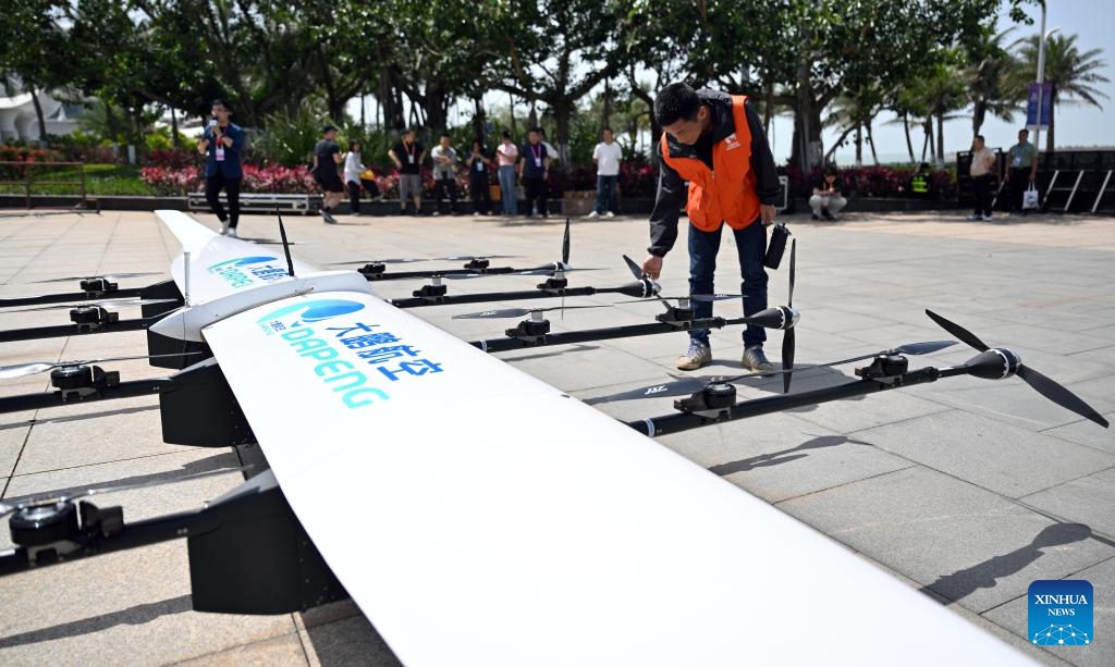 Ein Mitarbeiter prüft eine Logistikdrohne vor der Ausstellungshalle der 5. CICPE. (15. April 2025, Xinhua)
