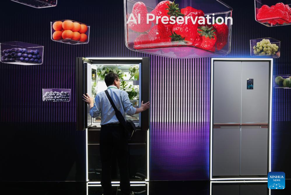 Ein Käufer informiert sich über einen intelligenten Kühlschrank während der 137. Kanton-Messe. (Foto vom 16. April 2025, Xinhua/Xiao Ennan)