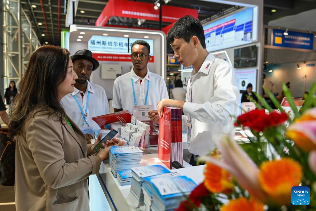 Ausländische Einkäufer informieren sich über Produkte im Ausstellungsbereich für neue Energieressourcen während der 137. Kanton-Messe. (Foto vom 16. April 2025, Xinhua/Xiao Ennan)