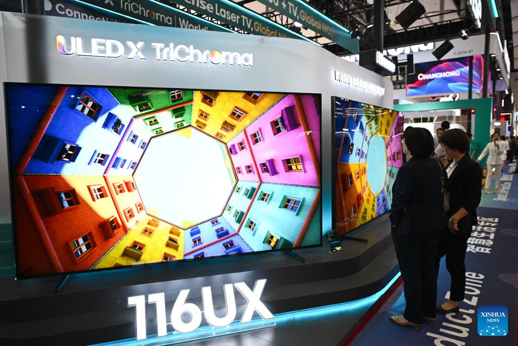 Besucher vor einem Großbildfernseher in der Smart-Life-Zone während der 137. Kanton-Messe. (Foto vom 16. April 2025, Xinhua/Deng Hua)