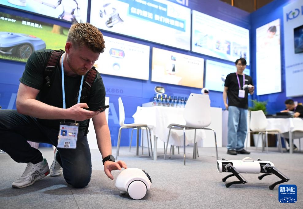 Ein Besucher beobachtet einen Haustierroboter und Bildungsroboter. (15. April 2025, Xinhua)