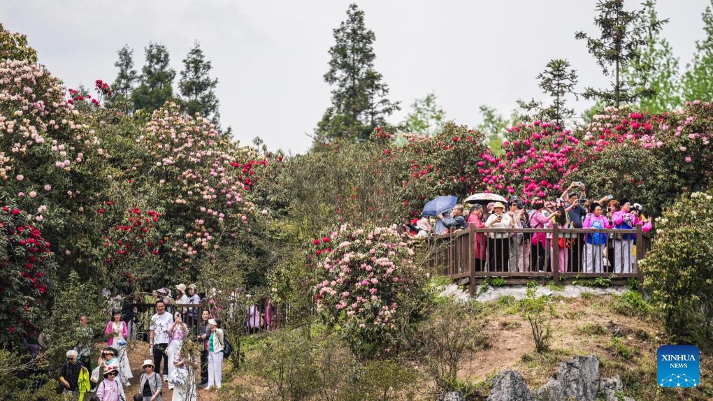 Touristen bestaunen Azaleen in einem nationalen Waldpark in der Stadt Bijie in der südwestchinesischen Provinz Guizhou. Die blühenden Azaleen in Bijie ziehen im Frühling viele Touristen an. (17. April 2025, Xinhua)