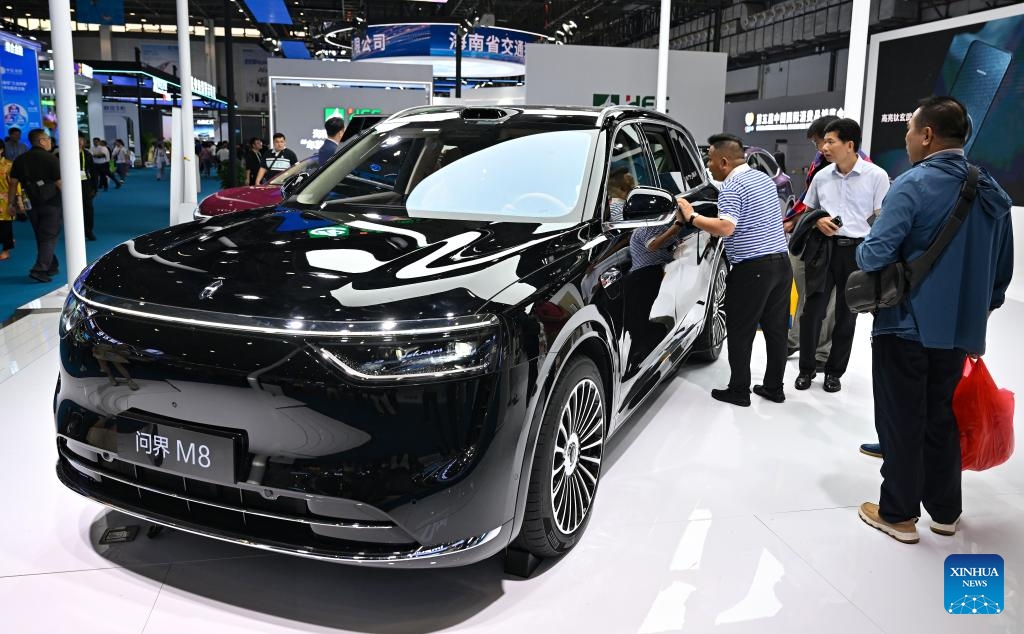 Besucher sehen sich das Elektroauto AITO M8 an, das von dem Autobauer Seres und dem Technologieriesen Huawei gemeinsam entwickelt wurde. (16. April 2025, Xinhua)