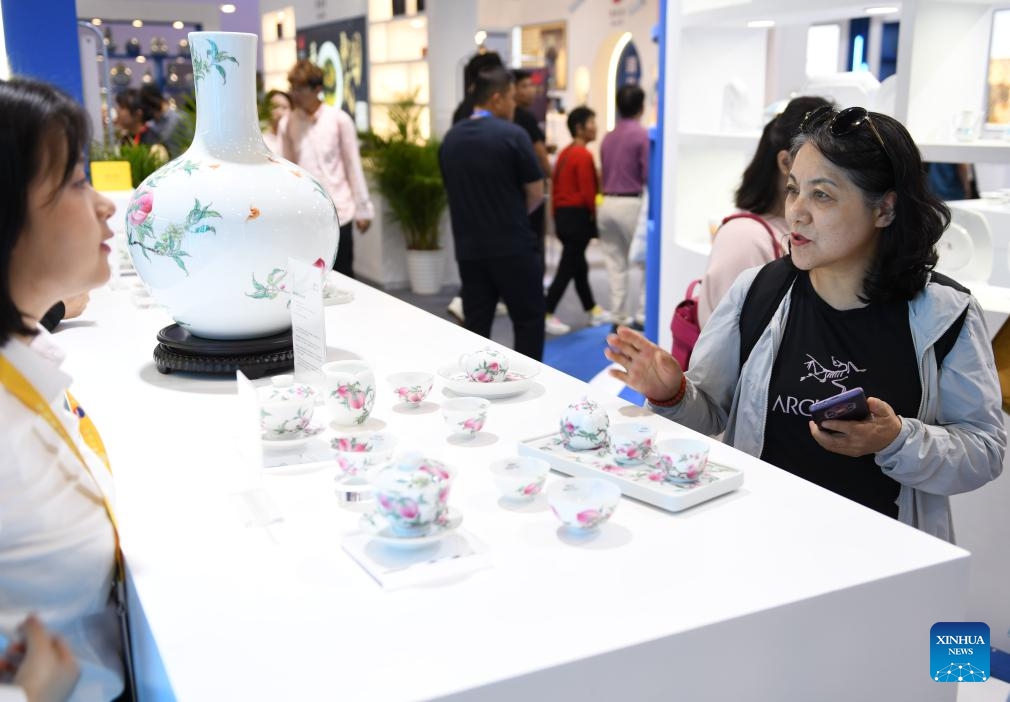 Porzellanexponate werden am Stand der „Porzellanhauptstadt“ Jingdezhen präsentiert. (16. April 2025, Xinhua)