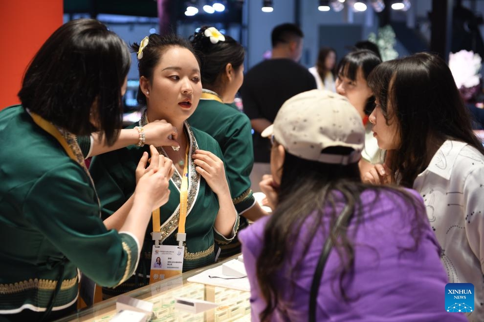 Aussteller zeigen den Besuchern Jade-Schmuck. (16. April 2025, Xinhua)
