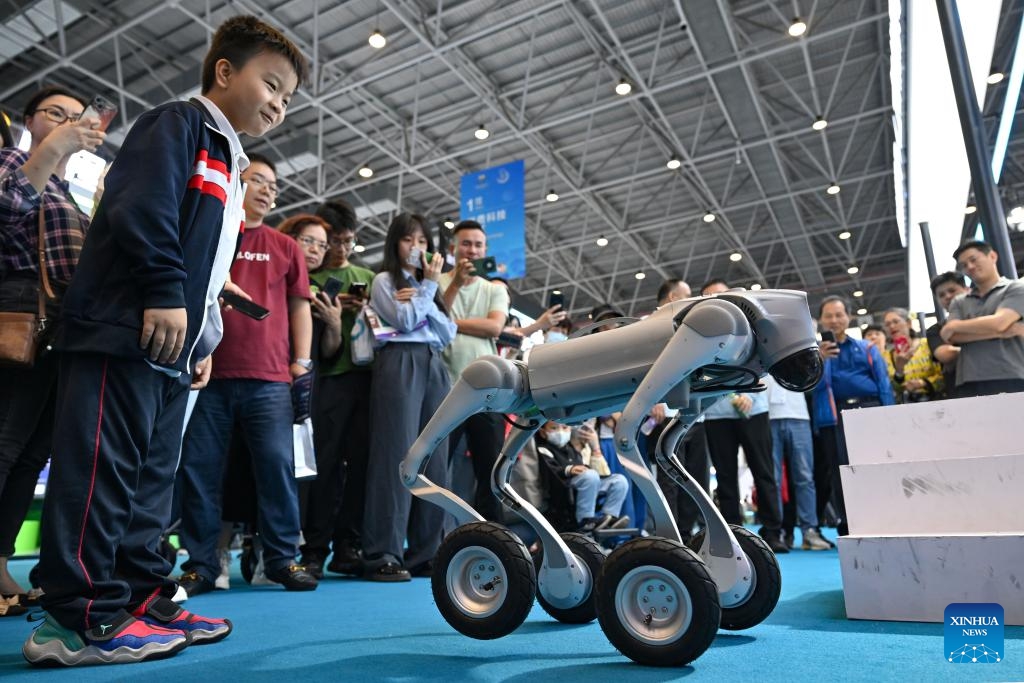 Besucher beobachten die Vorführung eines Roboterhundes. (16. April 2025, Xinhua)