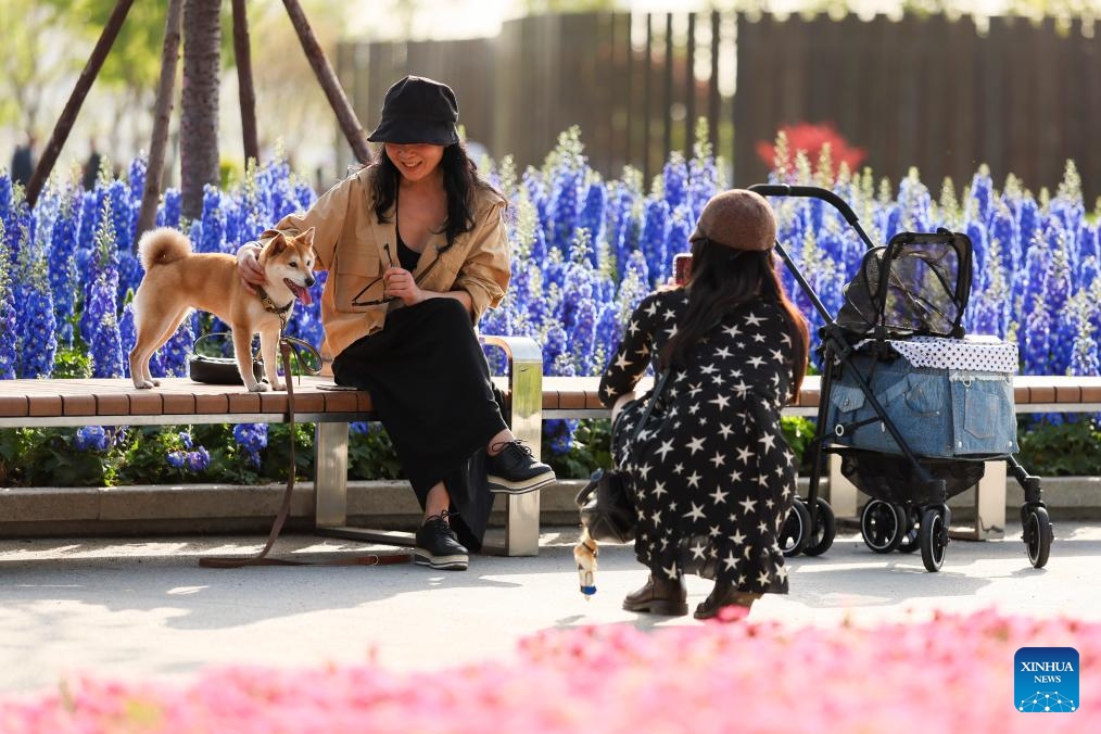 Menschen posieren mit Blumen für Fotos an einem Nebenveranstaltungsort der Internationalen Blumenschau 2025 in Shanghai. (18. April 2025, Xinhua)
