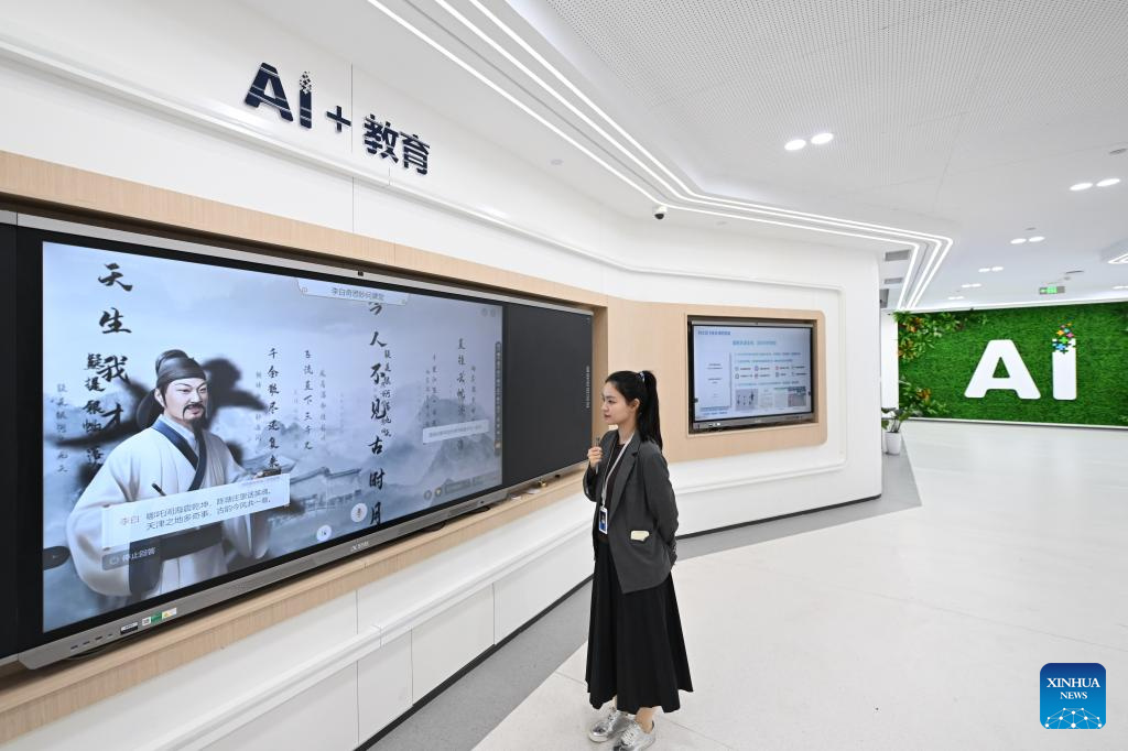Ein Mitarbeiter zeigt KI-gestützte (künstliche Intelligenz) Bildungslösungen im Tianjin-Standort von iFLYTEK. (Foto vom 18. April 2025, Xinhua/Sun Fanyue)