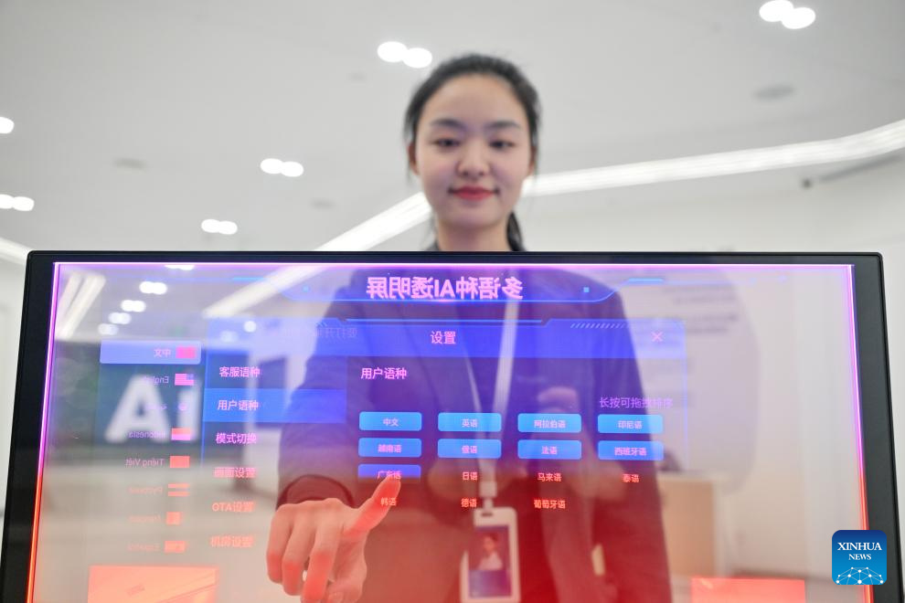 Ein Mitarbeiter zeigt ein mehrsprachiges KI-Echtzeitübersetzungssystem mit transparentem Display im Tianjin-Standort von iFLYTEK. (Foto vom 18. April 2025, Xinhua/Sun Fanyue)