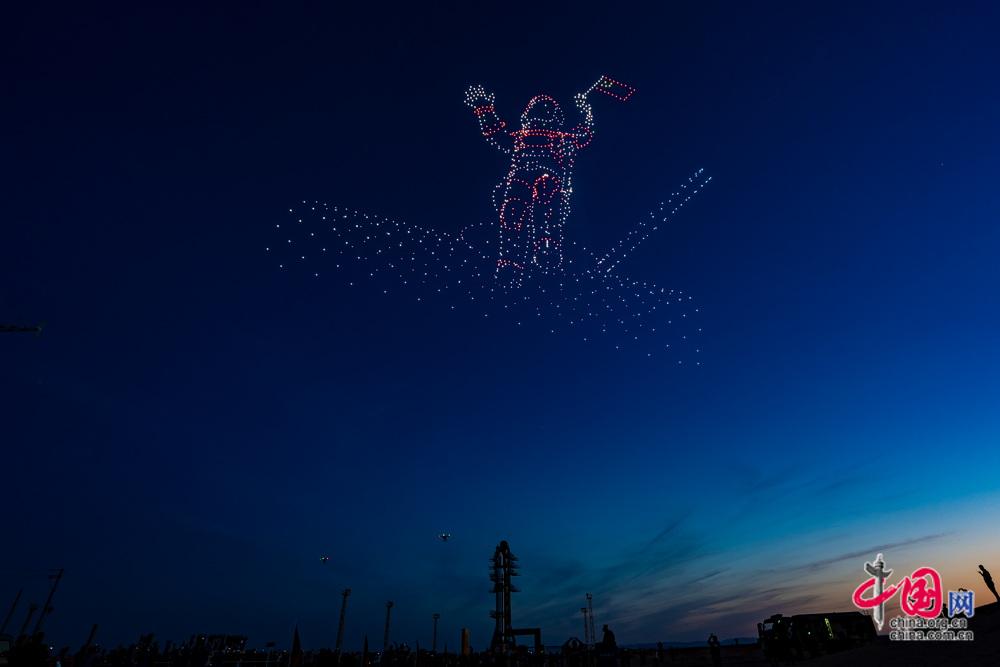Die Drohnen bilden eine Szene, in der der chinesische Astronaut Zhai Zhigang einen Weltraumspaziergang macht. (Foto vom 23. April 2025, Zheng Liang/China.org.cn)