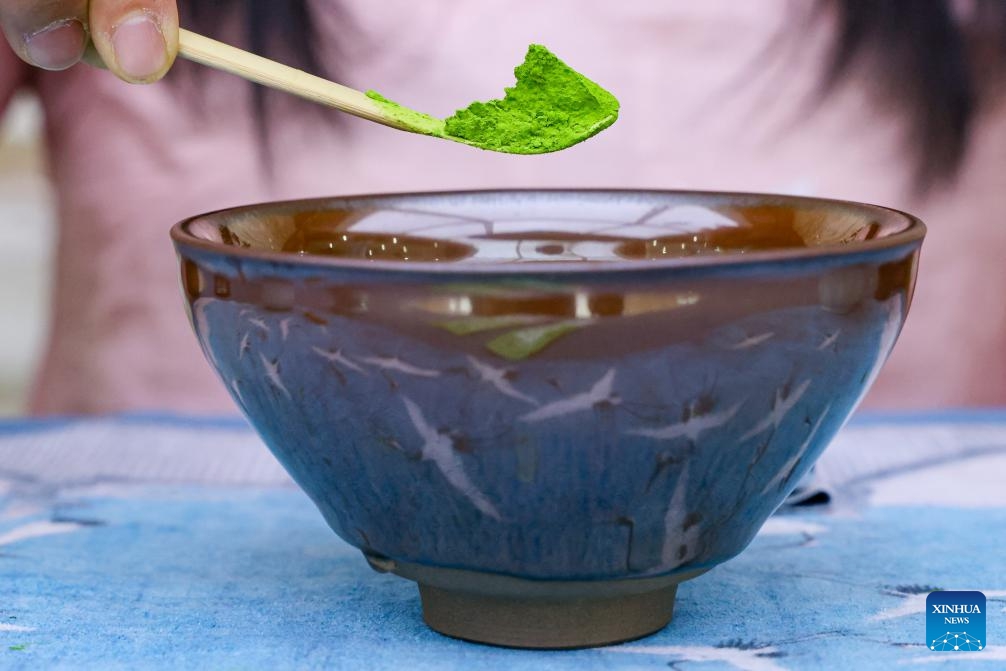Ein Mitarbeiter stellt in einem Tee-Industriepark ein Matcha-Getränk her. (14. April 2025, Xinhua)
