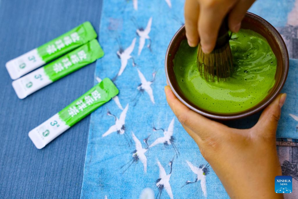 Ein Mitarbeiter stellt in einem Tee-Industriepark ein Matcha-Getränk her. (14. April 2025, Xinhua)