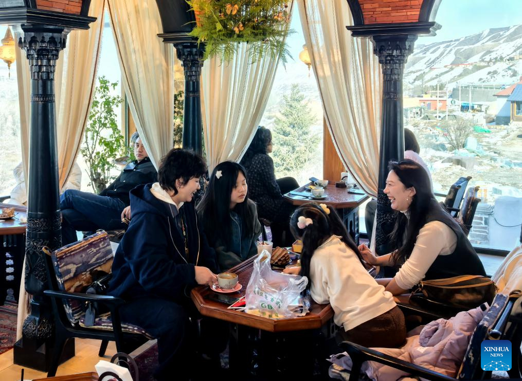 Kunden genießen Kaffee und ihre Freizeit in einem Café im Dorf Baiyanggou in Xinjiang, 15. März 2025. (Xinhua/He Xiaotong)