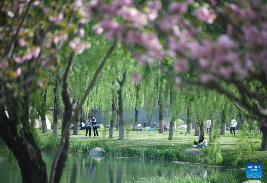 Menschen erfreuen sich an Blumen in einem Park in Xi'an. (8. April 2025, Xinhua)