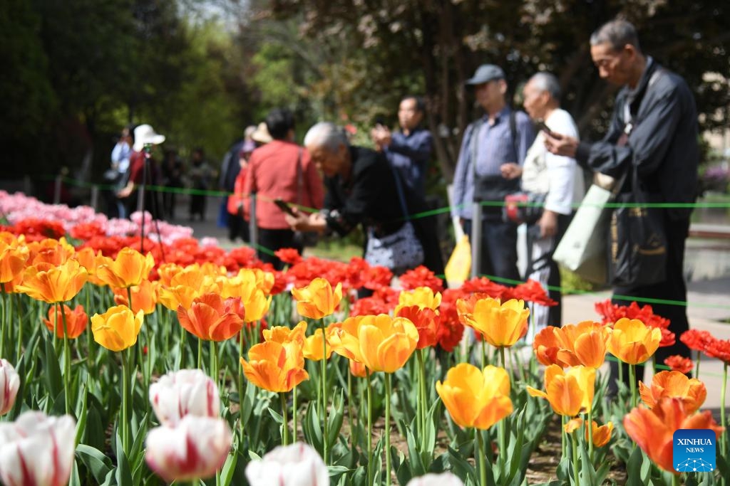 Menschen erfreuen sich an Blumen in einem Park in Xi'an. (10. April 2025, Xinhua)